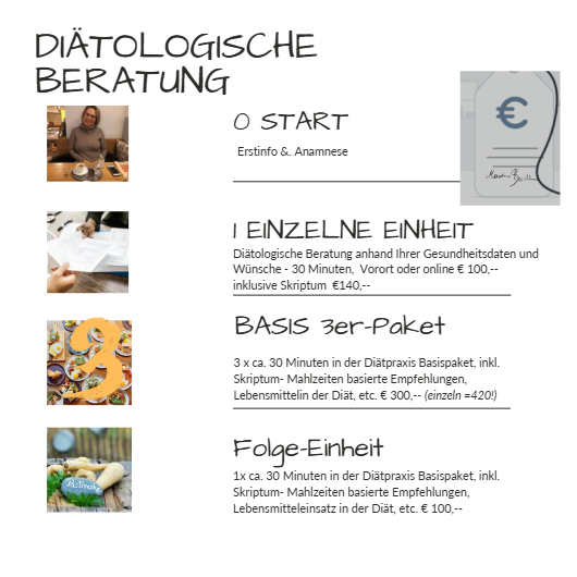 3 x ca. 30 Minuten in der Diätpraxis ist ein Erstpaket, inkl. Skriptum (3 x BIA-Messung wenn erforderlich = Körperfettmessung) – Mahlzeiten basierte Empfehlungen, Lebensmitteleinsatz in der Diät, etc.